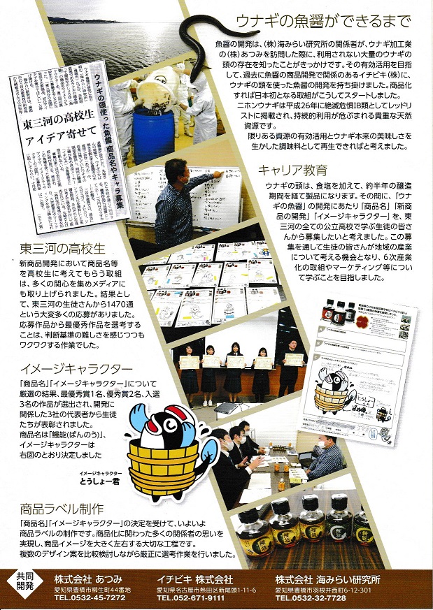 愛知県の記者発表資料によると、弊社と(株)あつみ、イチビキ(株)で共同開発したウナギの魚醤「鰻能(ばんのう)」が、「2021年度愛知のふるさと食品コンテスト(2021年8月4日実施)」において最優秀賞(知事賞)を受賞しました。