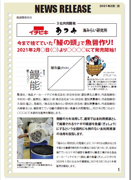 弊社は、(株)あつみとイチビキ(株)と共同で開発したウナギの魚醤「鰻能(ばんのう)」の、商品発表会を2021年3月23日(火)16:00から、豊橋商工会議所508会議室で行います。アイディアが生まれてから醸造期間を経て、やっと、商品発表会を迎えます。