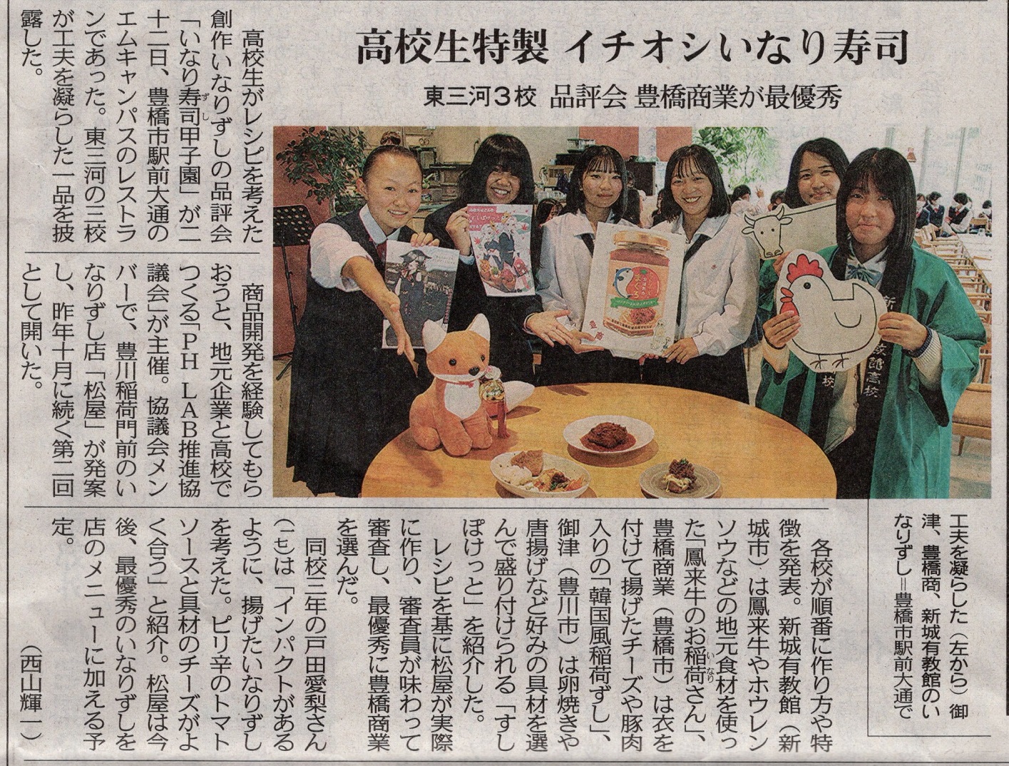 弊社はこのPHLab推進協議会の事務局を担当しています。この取組の中で昨年10月、豊川稲荷表参道商店街が主催する“ほいとも祭”にて「第1回いなり寿司甲子園」(豊川稲荷門前「松屋」監修。専門高校による創作いなり寿司コンテスト)を開催し、4校(豊橋商業高校、三谷水産高校、新城有教館高校、御津高校)が参加して大変盛り上がりました。