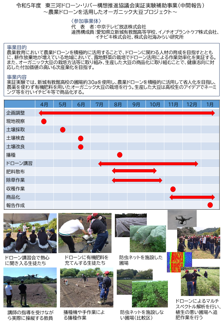 2023年10月31日(火)、新城市役所において、東三河ドローンリバー構想推進協議会が主催する第5回作業省力化研究会で、令和5年度実証実験補助事業の中間報告を行いました。この補助事業「農業ドローンを活用したオーガニック大豆プロジェクト」は、中京テレビ放送(株)や新城有教館高校などが参加し、弊社がコーディネートしています。