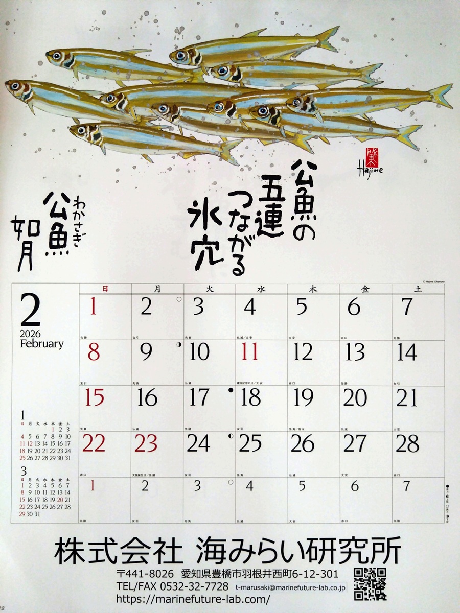 3月はどうなるのでしょう!? 日照り続きの1~2月と違い、3月は低気圧と高気圧が短い周期で訪れます。雨不足による水不足が深刻な中、低気圧にはまとまった雨が降り、高気圧の際には凪となる。そんな天候を期待したいです。2月のカレンダーは公魚(わかさぎ)でした。「公」の由来は将軍家御用達の魚「御公儀の魚」という意味で、公魚という漢字があてられたそうです。殿様の気分になって公魚の天ぷらで一杯といきますか。いつも「いっぱい」飲みますけれど。
