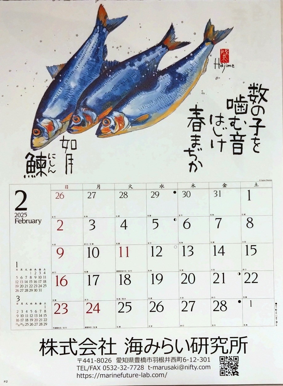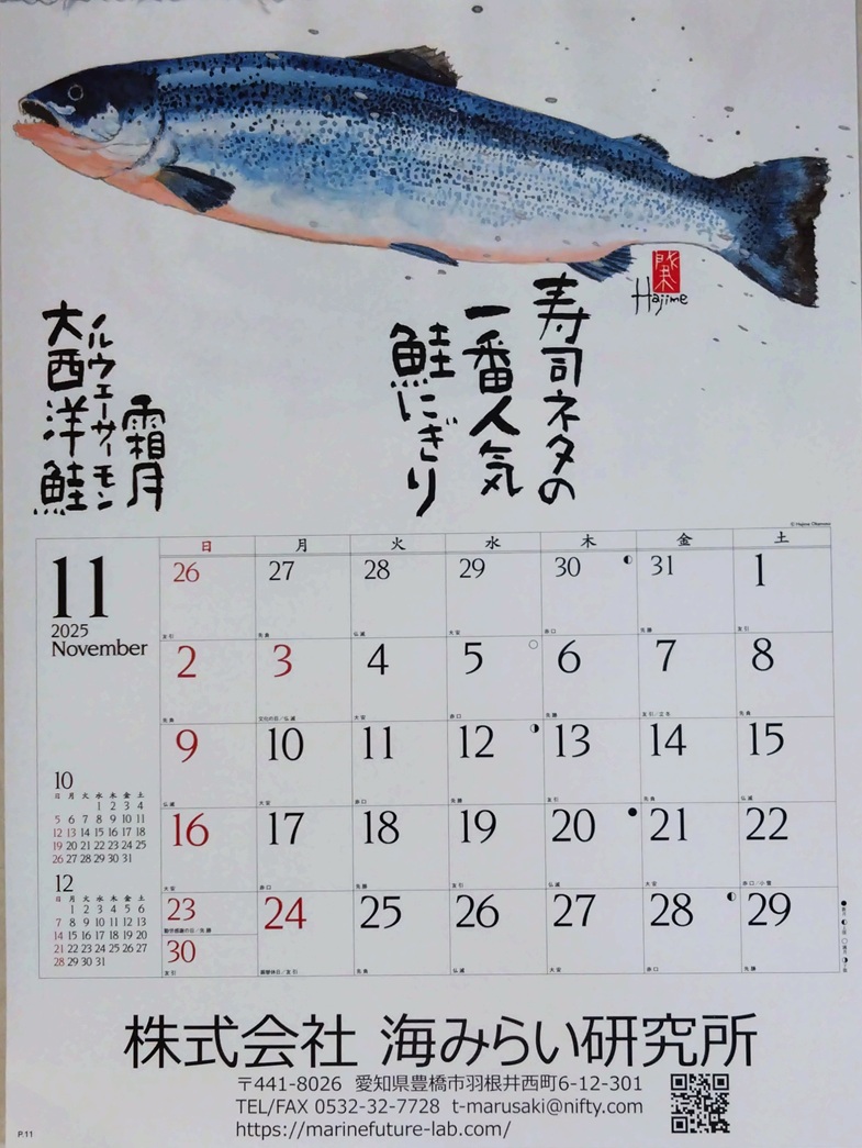 10月と同様に11月もほとんど凪がありませんでした。結局マリーナでボート整備と釣り具の整理を行っただけでした。ボートフィッシングの主戦場の遠州灘は、夏の海から一気に冬の海になったように感じます。日本の四季はどうなったのでしょうか? 12月からはますます凪のタイミングが少なく出港の機会が少なくなりますので、長期予報をにらみながら凪のタイミングに仕事がないように調整を行って、少ないチャンスにかけたいと思います。弊社の来年のカレンダーは日頃お世話になっている方々に配り始めています。来年も本年と同様に魚彩時記のシリーズです。ある中学の校長先生は魚のイラストを切り取って校長室に飾ってくださっています。大切に扱っていただいてとてもうれしく思いました。