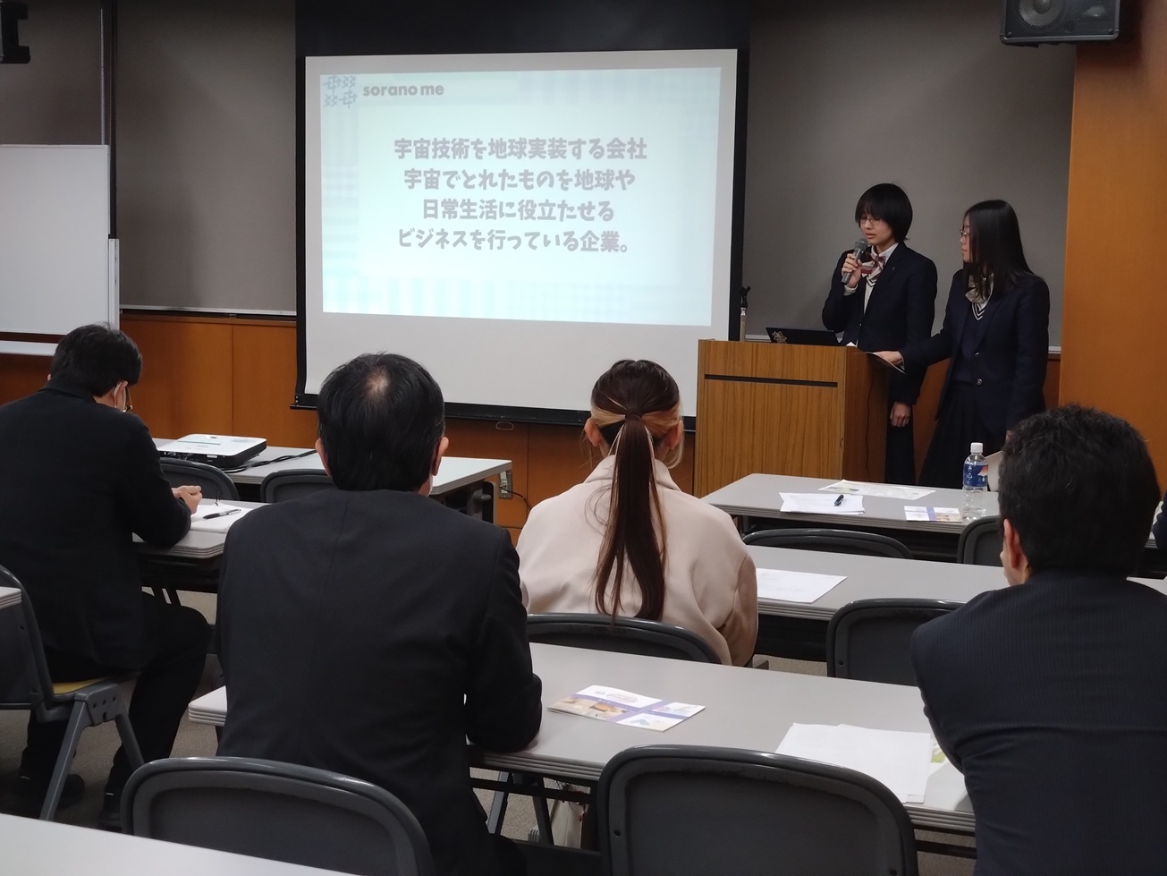 当日は、豊橋商業高校、国府高校、豊川工科高校の皆さんが、開発した商品のベトナムにおける販売実習や、宇宙ビジネスに関する取組、地域社会の実情を把握しながら連携の在り方の考察、地域企業から材料の提供を受けて様々な形態のコマを製作し、材料特性を理解する等の取組についてプレゼン方法を工夫しながらわかりやすく発表してくれました。