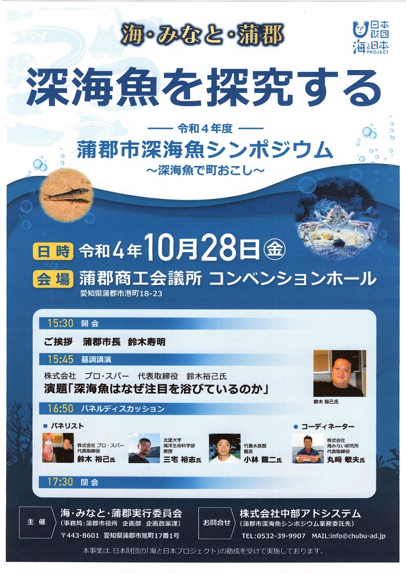 このシンポジウムは深海魚で町おこしを目指して、蒲郡市で多く水揚げされる深海魚について、様々な視点で学ぶ取組です。基調講演は「深海魚はなぜ注目を浴びているのか」と題して、(株)プロスパー代表取締役鈴木裕己様が行います。