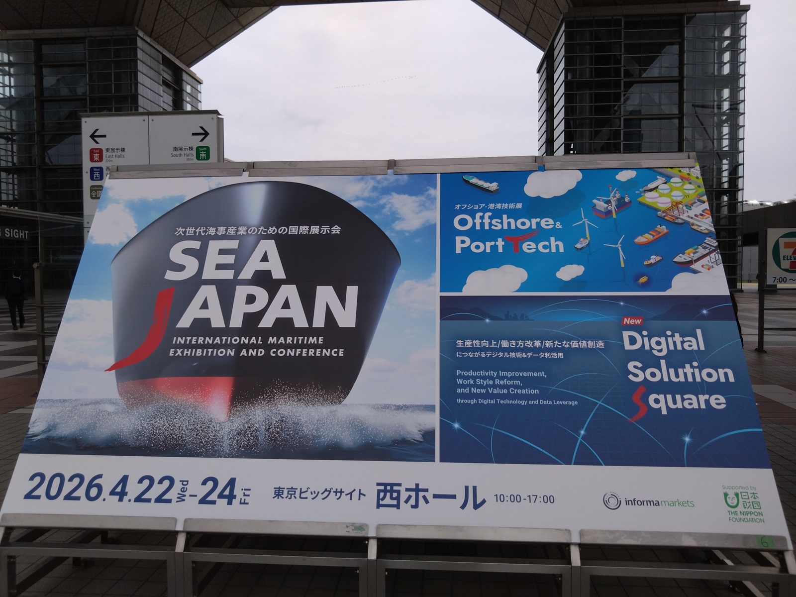 2026年4月24日(金)、東京ビッグサイトにおいて、次世代海事産業のための国際展示会「SEA JAPAN」を視察しました。この展示会は1994年から隔年で開催されていて、造船・海運・舶用機器など海事産業のための国際展示会として、新製品の発表や新たなパートナーの発掘、業界ネットワークの構築の場となっています。