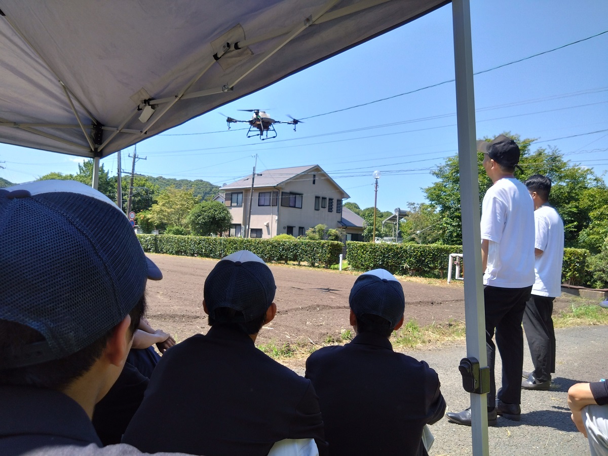 また、農業科の先生方に農業ドローンの実技講習会を実施するとともに、生徒の皆さんにはドローン研修会を実施します。栽培された大豆はイチビキ(株)等の協力により商品化を目指します。生徒の皆さんは農業ドローンの飛行の目の当たりにして興味津々でした。