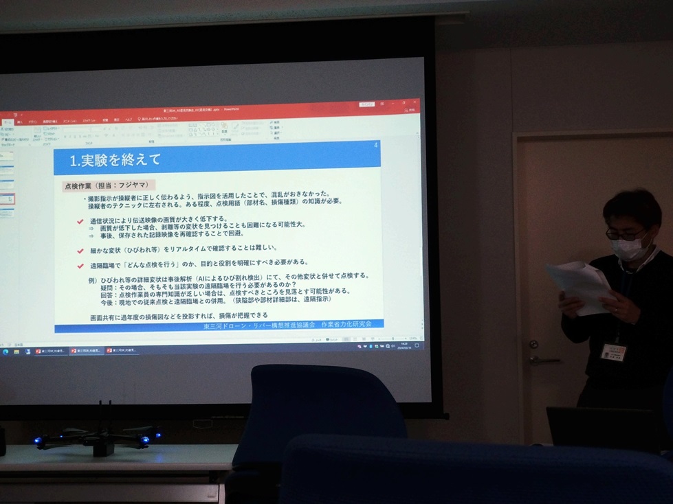 2024年3月14日(木)、新城市役所において実施された、東三河ドローンリバー構想推進協議会の、作業省力化研究会インフラ点検分科会に出席し、遠隔臨場を活用した施設点検実験の取組についての発表を聞きました。