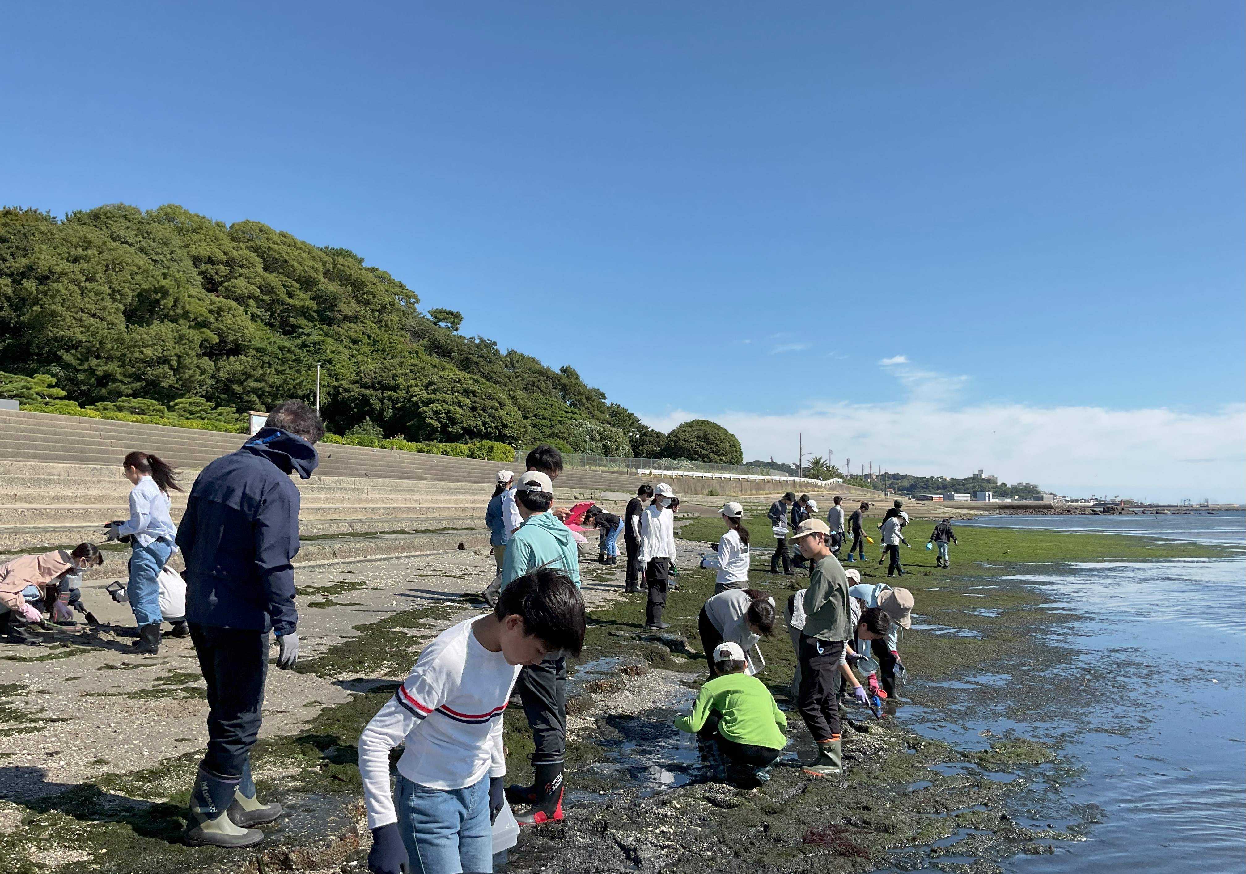 講義の後には、竹島海岸(愛知県蒲郡市)での干潟観察により生物多様性への理解を深め、海洋ゴミの回収活動を行いました。生徒たちの探究学習の一環として実際の自然環境に触れながら学びを深める貴重な機会となりました。